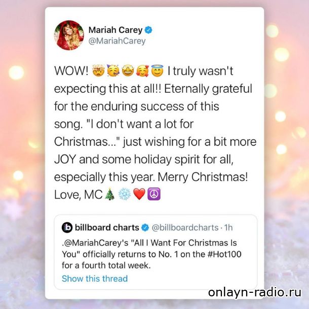 В понедельник 50-летняя Мэрайя написала в Твиттере о своем волнении и благодарности своим поклонникам после того, как несколькими часами ранее опубликовала праздничное видео в Instagram, признав свой успех в британском чарте.