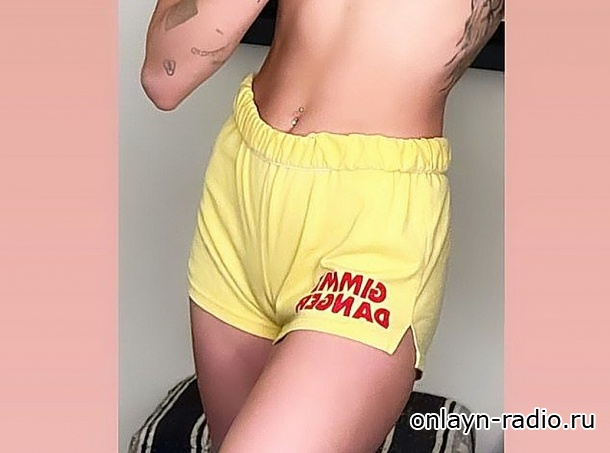 Майли позировала в одних желтых шортах с вышитой на них красной надписью "Gimme Danger". Она прикрыла грудь руками с черным лаком на ногтях.