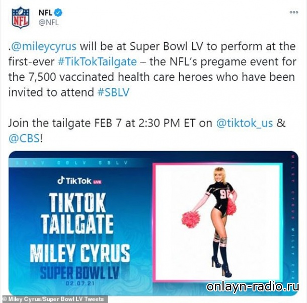 Певица звезда предматчевого шоу TikTok Tailgate на Super Bowl LV, которое пройдет в воскресенье. И всю нынешнюю неделю Майли Сайрус упорно трудилась над продвижением своего выступления, которое будет транслироваться одновременно в социальных сетях и на канале CBS.