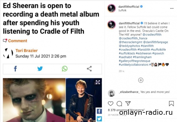Эд Ширан хотел бы записать музыку в стиле метал. Фронтмен Cradle Of Filth засомневался