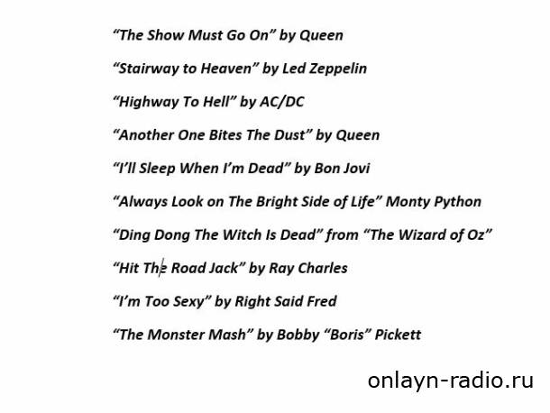 Phaneuf – похоронное бюро из Новой Англии – региона, находящегося на северо-востоке США, опубликовало список самых популярных песен, которые исполняют скорбящие на похоронах. Среди наиболее часто заказываемых были такие песни, как My Way Фрэнка Синатры, Unforgettable Нэта Кинга Коула и We’ll Meet Again Веры Линн. Но популярны и более необычные музыкальные произведения.